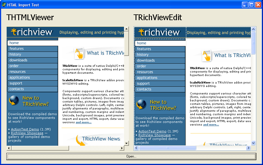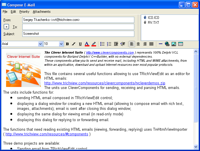 Estão disponíveis projetos de demonstração, incluindo um cliente HTML de correio eletrônico totalmente funcional. As funções da janela de diálogo requerem o RichViewActions. As funções que precisam ler em HTML requerem o TrvHtmlViewImporter.