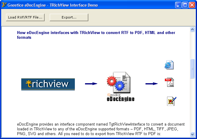 O Gnostice eDocEngine converte documentos TRichView para PDF, XHTML, Excel, Quattro Pro, Lotus 1-2-3, DIF, SYLK, SVG (XML baseado em vetores gráficos), TIFF, PNG, JPEG, GIF, BMP, EMF, WMF, RTF, HTML, e outros formatos. No eDocEngine v3, a conversão para PDF é agora totalmente compatível com Unicode e está habilitada com uma incorporação mais compacta de subconjuntos de fontes.