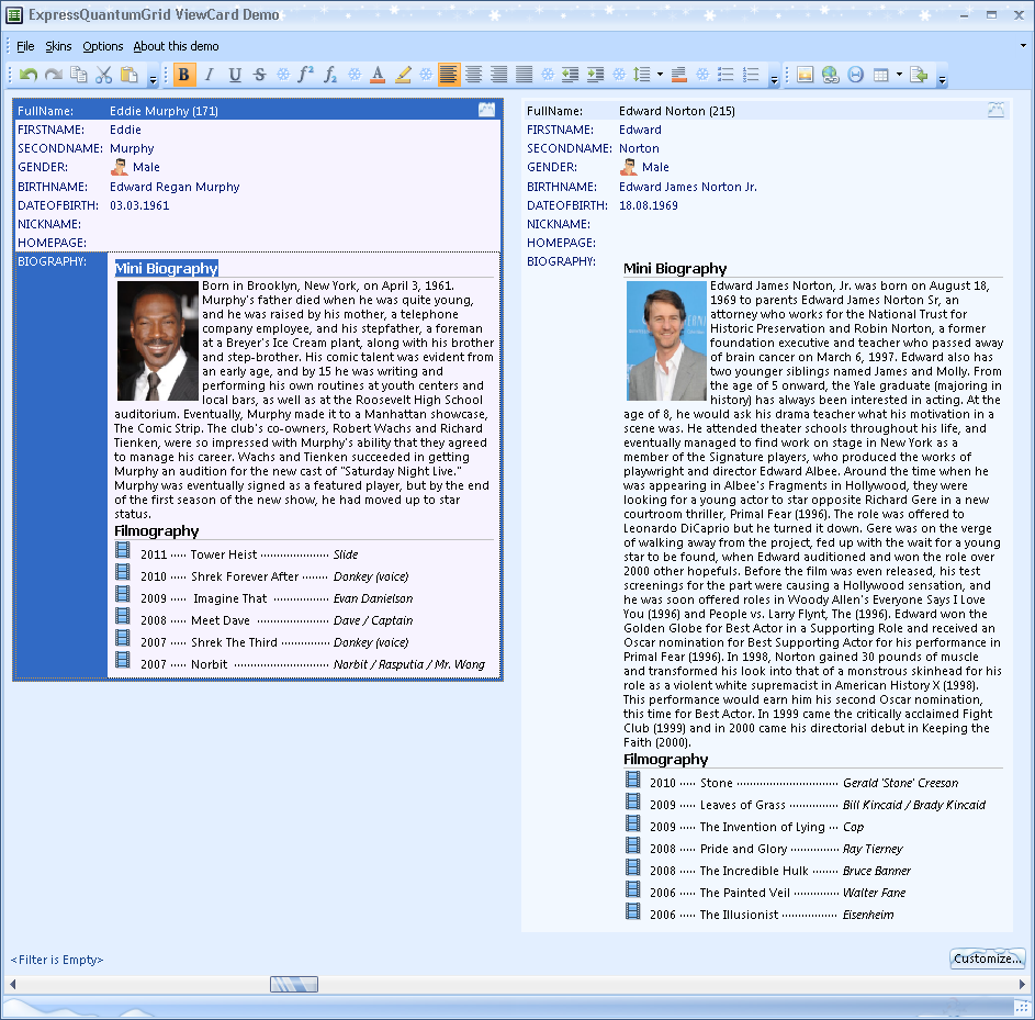 TcxGrid é um modo de visualização de cartão; TRichViewEdit é usado para o campo “Biography”.